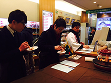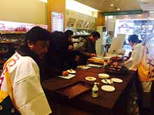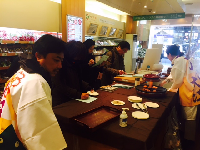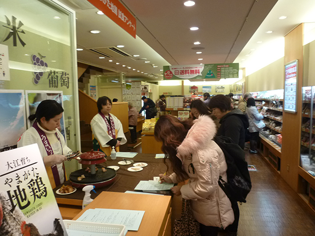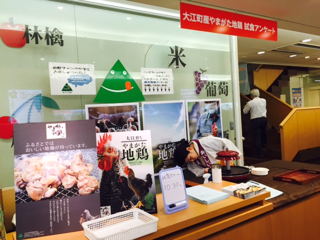 2月4日(土)、東京銀座のおいしい山形プラザにてやまがた地鶏の試食PRを行いました。 来店されたお客様にお声がけし、シンプルに塩胡椒で味付けした一口サイズのモモ肉とムネ肉を、一切れずつ食べ比べしていただきました。 「やわらかくてとても美味しい。」「旨みがたっぷりでくさ味が全くない。」「今日は販売してないの?」などと、舌の肥えた銀座のお客様にもご満足いただきました。