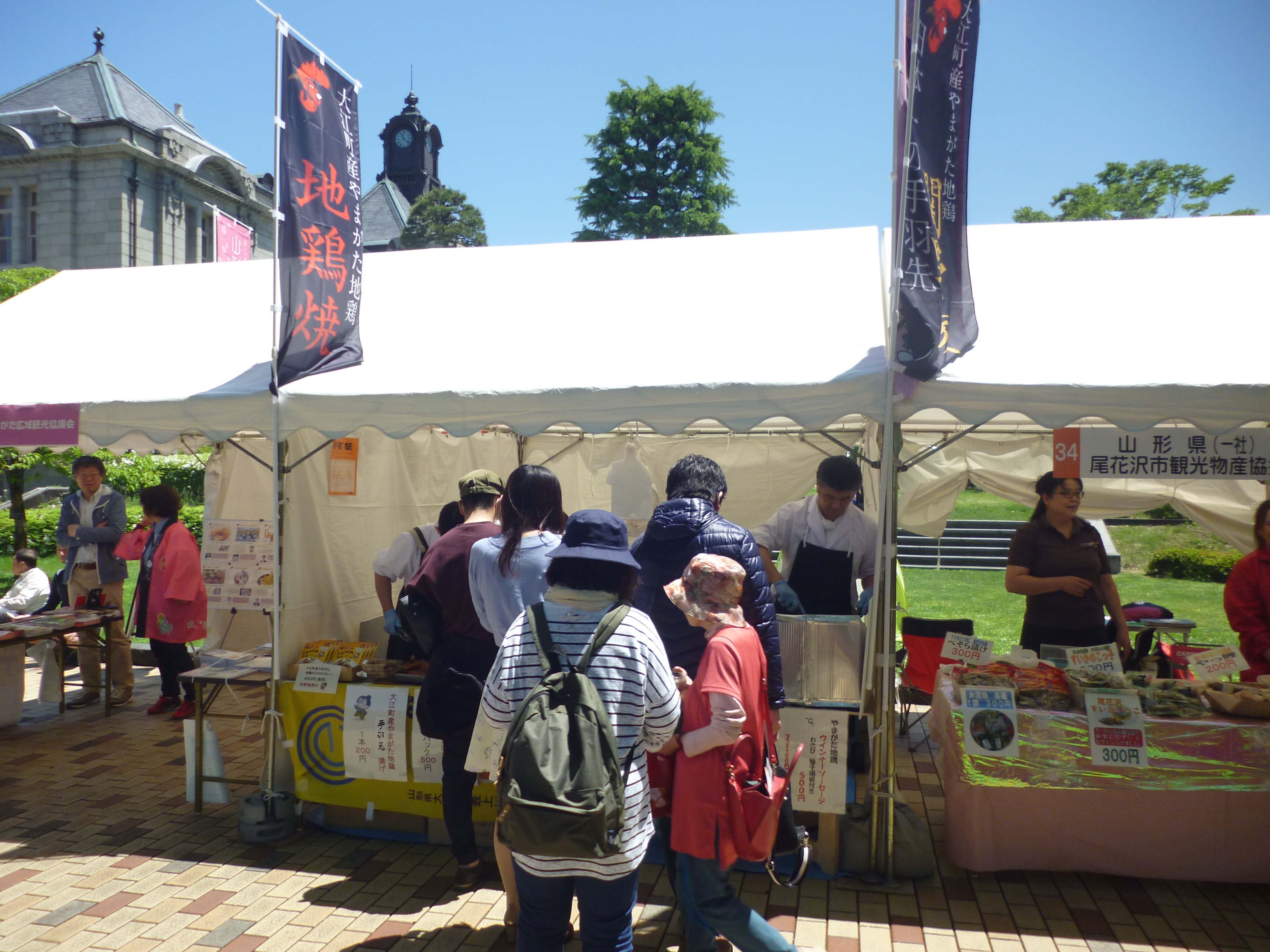 平成30年5月20日(日)、山形市の文翔館において「IWC(インターナショナルワインチャレンジ)2018「SAKE部門」やまがた開催記念日本酒チャリティ試飲会」が開催され、地域の食材を使ったメニューとして大江町の関野家さん(食堂)から「やまがた地鶏」の手羽先・手羽元のから揚げや、地鶏を鉄板で焼いた地鶏焼、地鶏ウインナーを提供していただきました。