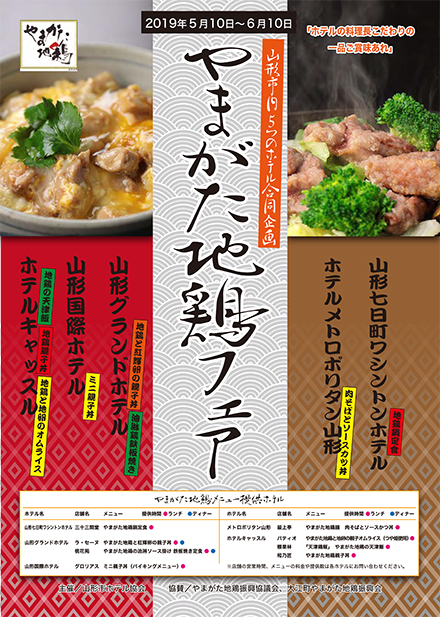 今回、山形市内5つのホテルの合同企画として、大江町産やまがた地鶏を使って様々な料理をご提供する「やまがた地鶏フェア」が開催されます。期間は5月10日から6月10日までとなっています。皆様、ぜひこの機会に各ホテル自慢のやまがた地鶏料理をご賞味ください。